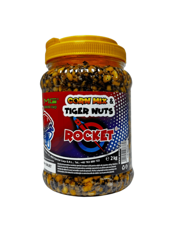 Corn Mix Rocket MG Special Carp to profesjonalna mieszanka kukurydzy karpiowej i orzechów tygrysich orza innych nasion porawiającą atrakcyjność, która została opracowana w celu maksymalnego zwiększenia skuteczności połowu. Połączenie naturalnych ziaren z intensywnym aromatem Rocket sprawia, że produkt szybko przyciąga ryby i utrzymuje je w polu nęcenia.