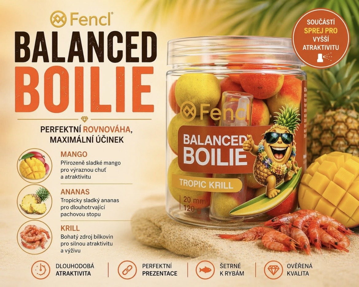 Fencl Tropic Krill 20 mm to kulka zbalansowana typu balanced boilie stworzona do łowienia karpi w sposób selektywny i skuteczny. Połączenie ananasa, mango i krilla daje mocny, rozpoznawalny profil, który dobrze pracuje zarówno na łowiskach komercyjnych, jak i podczas dłuższych zasiadek. Przynęta lekko unosi się nad dnem, dlatego prezentuje się naturalnie i nie obciąża zestawu w sposób charakterystyczny dla zwykłej kulki tonącej. Duży rozmiar 20 mm pomaga ograniczyć brania drobnicy i skupić się na większych karpiach. W opakowaniu znajduje się również spray aromatyczny, który pozwala zwiększyć atrakcyjność przynęty i dopasować jej działanie do warunków. To przynęta dla osób, które chcą łączyć mocny sygnał zapachowy z bardzo dobrą prezentacją.